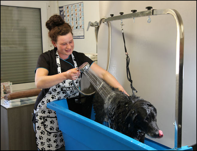 All scissors and blades are cleaned and sanitised before and after use. The professional grooming table is hydraulic and there is an optional ramp for easy access into the dog bath for older dogs, large dogs or dogs that don’t like to be lifted.